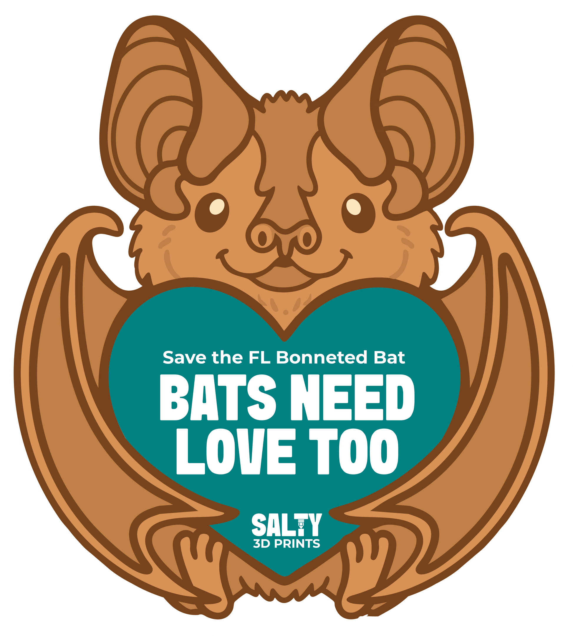 Our Bats Need Love Too sticker features our original Bonneted Bat artwork, created to raise awareness for one of the most endangered mammals in North America: the Florida Bonneted Bat. With fewer than 1,000 believed to remain, awareness truly matters.